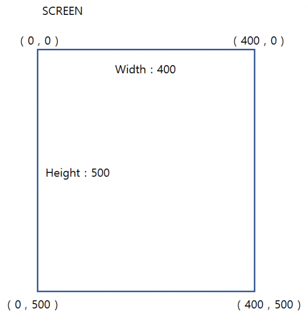 가로, 세로가 400, 500인 길이를 가진 스크린을 생성했다면 각 좌표값은 아래와 그림과 같다.
