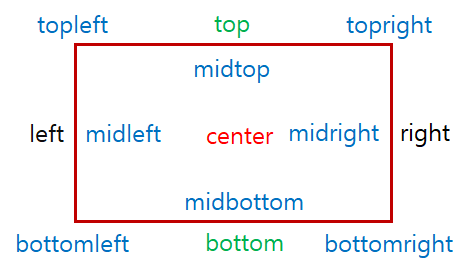 이와 같이 Rect의 각 선분의 값들을 계산을 통해서 구할 수 있지만, pygame의 Rect 객체는 각 모서리, 선분의 중간값등의 가상의 좌표를 제공해준다. 각 모서리의 가상의 이름은 아래 그림과 같다.