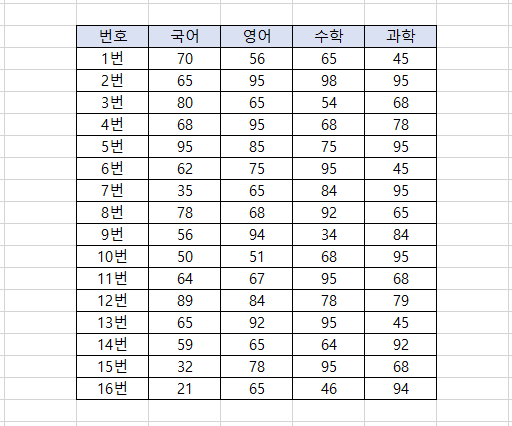 | 번호 국어 영어 수학 과학 0 1번 70 56 65 45 1 2번 65 95 98 95 2 3번 80 65 54 68 3 4번 68 95 68 78 4 5번 95 85 75 95 5 6번 62 75 95 45 6 7번 35 65 84 95 7 8번 78 68 92 65 8 9번 56 94 34 84 9 10번 50 51 68 95 10 11번 64 67 95 68 11 12번 89 84 78 79 12 13번 65 92 95 45 13 14번 59 65 64 92 14 15번 32 78 95 68 15 16번 21 65 46 94 |