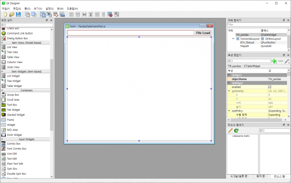 아래와 같이 UI 파일을 만든다. UI파일의 배치는 자유, 다만 QTableWidget은 필수이다.