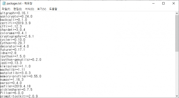 생성된 packages.txt 을 보면 패키지 이름과 버전이 연결되어 있다.